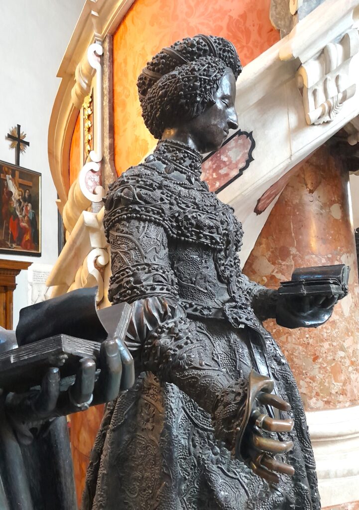 Eine aktuelle Installation im Kreuzgang des Volkskunstmuseum verleitet mich, wieder einmal die „Schwarzmanderkirche“ zu besuchen und damit meine friedenspolitischen Gedanken mit der Kunsthistorie zu verknüpfen. 28 überlebensgroße Bronzestatuen stehen Spalier am Kenotaph von Kaiser Maximilian, der dann doch nicht darin begraben wurde, stehen also letztlich irgendwie umsonst in ihrem ganzen Prunk da. „Schwarzmander“ müsste jedenfalls gegendert werden, weil unter den 28 Statuen auch achte Frauengestalten sind. Was auffällt: Alle Männergestalten sind ritterlich schwerstbewaffnet, ausgestattet mit Schwert und Dolch, bekleidet mit schwerer Kettenrüstung, mit Harnischen, Armschienen, Panzerhandschuhen und Eisenschuhen. Es ist in Bronze gegossene Entschlossenheit zum Kämpfen, zum Kriegen, zum Töten. Auf der anderen Seite sind da die Frauengestalten. Keine dieser Frauen trägt eine Rüstung, keine Schwerter, keine Dolche. Man muss sich vor ihnen nicht fürchten. Die Frauen halten in ihren Händen Bücher, in die sie blicken. Weise und starke Frauen – nicht bereit für den Kampf. Die Hofkirche zu Innsbruck stellt damit ein friedenspolitisches Sinnbild auch für die Gegenwart dar. Der Kriegskaiser Maximilian I. hinterließ aufgrund seiner Kriegspolitik ein Reich in Schulden. 28 grausame Kriege soll er geführt haben. Maximilian war Feldherr und Kriegsmann. Er setzte auf militärische Gewalt und trieb den Auf- und Ausbau der habsburgischen Rüstungskapazitäten weiter. Seine imperiale Zeit war geprägt von Gemetzeln und Eroberungen. Andererseits sind da die Frauen mit ihren Büchern, die ihre Männer in sinnlosen Eroberungsschlachten verloren. Keine Gewalt, keine Waffen, kein Eisengewand, sondern lustvoll verspielte Kleider. Ich denke an Greta und die Gaza-Friedensflotte. Beim Hinausgehen aus der Kirche steht wie eine Faust aufs Auge übermächtig hässlich das Standbild von Andreas Hofer an jener Stelle, wo seine Gebeine begraben sind. Daneben erinnert eine Grabplatte an Pater Haspinger, der mit erhobenem Schwert und religiöser Rhetorik zu Beginn des 19. Jahrhunderts in antiwoker Gesinnung und beseelt von Verschwörungsmythen zu einer finalen Schlacht gegen Bayern und Franzosen aufrief. Ein Mann, der als Mitglied eines franziskanischen Ordens in der Tradition des Heiligen Franz stehen sollte, wurde zum Kriegshysteriker. Seine Sprache und sein Tun erinnern an die religiös martialischen Kräfte, die heute zu den schlimmsten Blutbädern führen. Noch einmal denke ich an den Text der Kaddish, die von den Künstlern beim Ausgang auf den Boden gelegt wurde: ein Banner mit großen hebräischen Buchstaben, über denen Glasscherben liegen und braune Fußabdrücke darauf zu finden sind. Ich höre die Nachrichten aus dem Nahen Osten und die Hoffnung lebt, dass die weisen Bücher in den Händen doch stärker sein könnten als die Schwerter.
