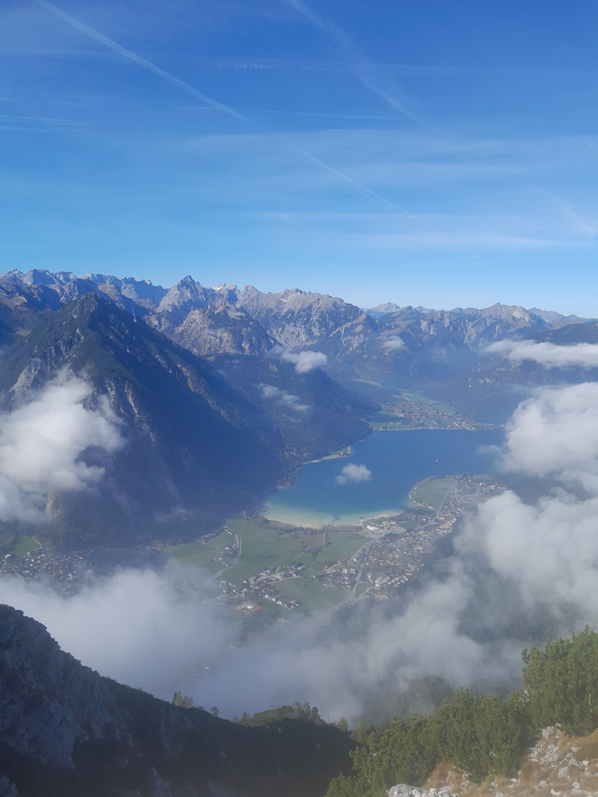 Ein kleines, feines, einfaches Bergziel haben wir gewählt, um den Tag mit den Farben und Düften und Stimmungen des Herbstes zu füllen. Im Inntal lärmt der Massenverkehr. Der Startpunkt unserer Tour ist bei der Kanzelkehre an der Bundesstraße, die vom Inntal zum Achensee hinaufführt. Ein gelbes Schild mit rotem Punkt zeigt schon das Ziel an. Ebner Joch. Ein Pfad durch einen Mischwald. Die Laubbäume strahlen goldgelb. Noch hängen Nebelbänke an den Wänden des Rofangebirges. Die Hälfte der Tour liegt bei der Astenau Alm, die auf einem Hochplateau liegt. Ein Berglaufevent findet gerade statt. Die Terrasse der Almhütte ist gut besucht. Die Nebelbänke sind nun unterhalb. Durch Latschenhänge und erst ganz zum Schluss etwas steiler über grasfelsiges Gelände geht es den guten Steig weiter bis zum Gipfelkreuz. 1100 Höhenmeter waren es. Ein perfekter Aussichtsberg – mit Blicken weit über das Achental, der Achensee als Blickfang, hinüber zu den Gipfeln des Karwendels, die Tuxer Alpen. Die Spitzen des Wilden Kaisers stoßen durch den Nebel. Beim Abstieg schenkt ein kurzes Verweilen in der Notburga-Kapelle eine religiöse Note. Sanftes Absteigen auf weichen Pfaden. Auf der Achensee-Straße donnern Motorräder. Die eigene Resilienz, um in widrigen Alltagswirklichkeiten stark zu bleiben, wurde gestärkt.