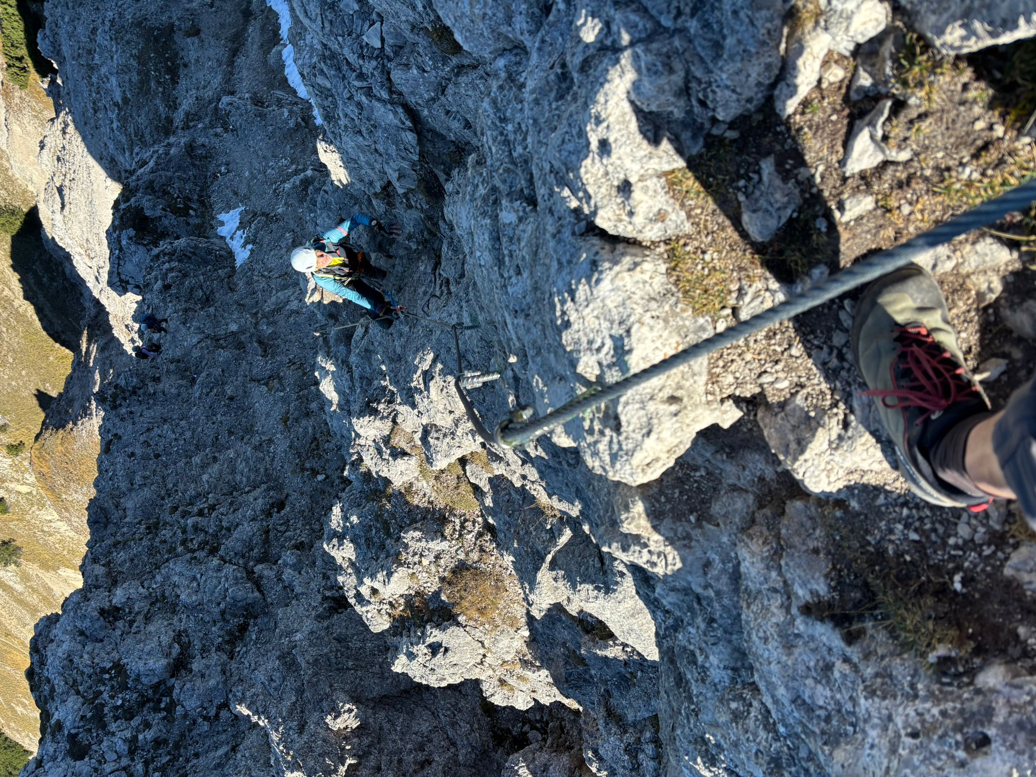 Über Innsbruck liegt noch eine dicke Wolkendecke. Die Laubbäume entlang der Karwendelbahn hinauf nach Seefeld sind gold-gelb oder rötlich gefärbt. Bei der Rosshütte, sind dann die Wolken unter uns und darüber ein kräftig-blauer Herbsthimmel. Die Rosshütte selbst ist zwar längst keine „Hütte“ mehr, sondern eine stattliche Mittelstation am Ende der Standseilbahn mit allen möglichen Einrichtungen von großem Restaurant, Spielplätzen und einem Speichersee davor. Von den Touristenmassen, die es zur Hochsaison hier hinaufspült, ist an diesem Nebensaison-Wochentag kaum etwas übriggeblieben. Das Gehen am Steig wärmt auf. Der Klettersteig ist gut angelegt. Mir kommt er diesmal etwas schwerer vor als zuletzt. Dennoch genieße ich es, dass kaum Tritthilfen verbaut wurden und die Füße beim Klettern am manchmal etwas rutschigem und zugleich festem Dolomitfels einen Halt suchen müssen. Entspannt ist dann die Rast am Gipfel mit großartigem Rundumblick. Unten ist der breit Seefelder Boden, eine weite und sanft buckelige und immer noch grüne Fläche. Der Westen wird markeirt von den beiden Gipfeln der Hohe Munde, dem sich dann die Mieminger Kette anschließt. Dominant überragt die Zugspitze die anderen Gipfel des Wettersteingebirges. Über dem Isartal sind die Arnspitzen. Im Osten und Norden ragen die vielen Karwendelgipfel heraus und im Süden weit im Hintergrund die hohen Gipfel der Stubaier und Zillertaler Alpen. Die Dohlen am Gipfel haben sich an die vielen menschlichen Zweibeiner angepasst und betteln fast furchtlos um Futter, das sie selbst aus menschlicher Hand picken.