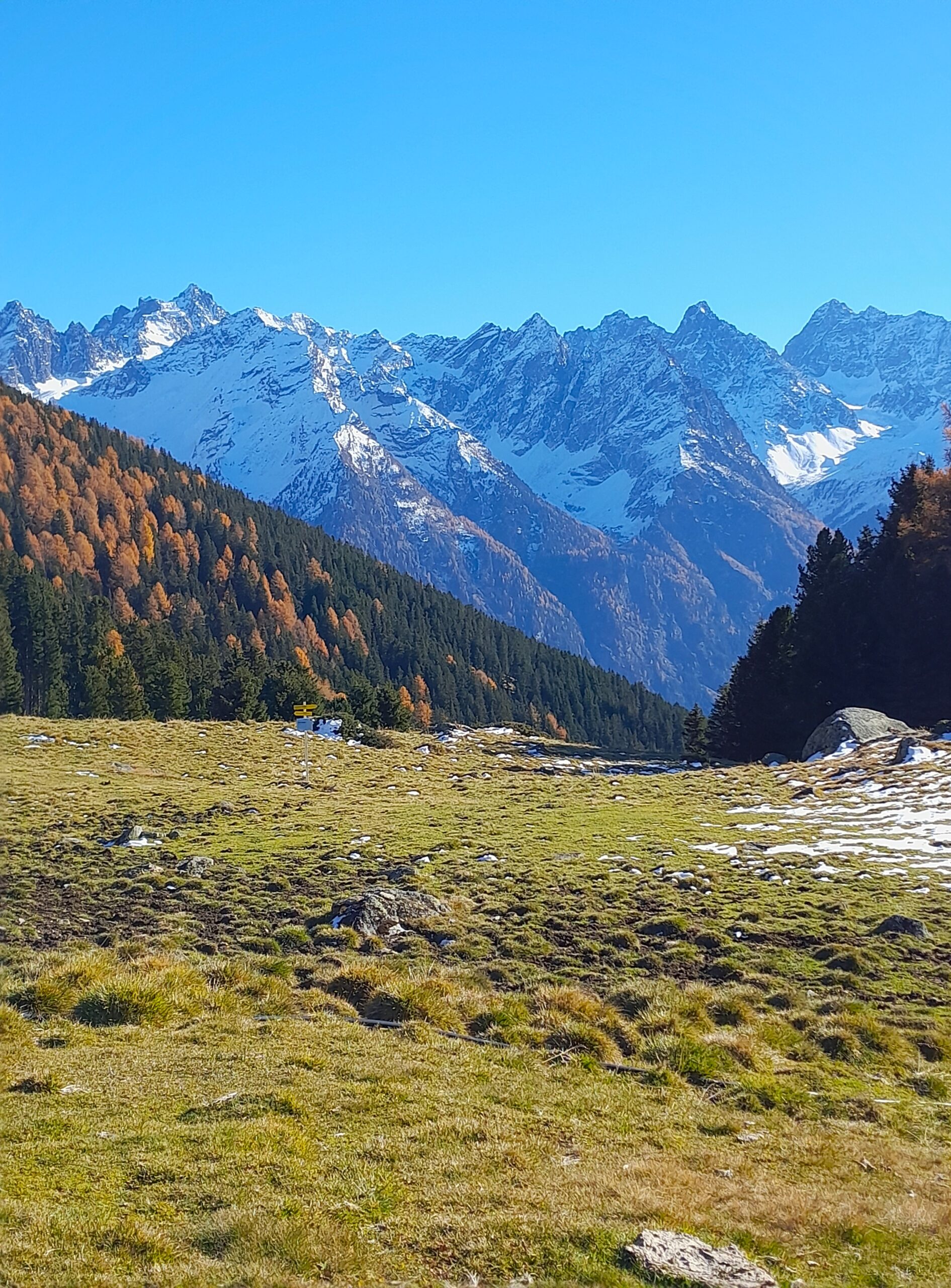 Die Zugfahrt schenkt zunächst eine unerwartete Begegnung, die in den Tag hinein positiv nachwirkt. Vom Bahnhof Landeck-Zams geht es mit Gravelbike vorbei am mächtigen Schloss Landeck zur Via Claudia Augusta, die zu römischen Zeiten über die Fließer Platte führte. Nur ein paar Meter sind es, die ich dabei schieben muss. Wald- und Wiesenwege und Forststraßen führen fast eben weit oberhalb des Inntales nach Fließ. Die Routenwahl erweist sich angesichts der Temperaturunterschiede zwischen Sonne und Schatten als goldrichtig, so golden, wie die Lärchen in der Herbstsonne leuchten, als käme das Feuer aus ihnen selbst heraus. Im Hintergrund sind wie in einer Alpenidylle die schroffen und strahlend weiß verschneiten hohen Gipfel des Kaunergrats, die ich in meiner Jugendzeit so ziemlich alle noch besteigen konnte. Von Fließ geht es nach einem Besuch im Widum die alte Pillerstraße hinauf zur Pillerhöhe bzw. zum „Gachen Blick“. Da muss ich das Rad stellenweise schieben, bevor es die Asphaltstraße über Puschlin hinunter geht zum Gasthof Wiesenjaggl und dann wieder anfangs über Asphalt und später den Almweg hinauf zur Aifner Alm auf 1980 m. Die Steigung ist konstant aber nicht zu extrem für das Gravelbike. Der Untergrund ist gut. Nur in den letzten Kehren hinauf zur Alm liegen auf einigen schattigen Stellen Schnee und Eis. Auf der Alm, die längst in Winterruhe ist. Ich höre in die Stille – eine Ruhe, die ich von der Innsbrucker Gegend schon gar nicht mehr kenne. Das Panorama an diesem klaren Herbsttag mit den goldenen Lärchenbäumen, die zwischen den Zirbenwäldern herausleuchten, und dem tiefblauen Himmel und den Tälern, die sich unterhalb ausbreiten, ist zu schön, um überhaupt Worte dafür zu finden. Lange wird die Abfahrt hinunter ins Tal nach Urgen. Dort gibt es keine Sonnenstunden mehr. Die Steine am Inn sind mit Schneekristallen überzogen und am Asphalt des Inntalradweges zurück nach Landeck liegt stellenweise Reif. Mit einer sportbegeisterten Begleiterin diese Runde zu machen, war eine zusätzliches Geschenk.