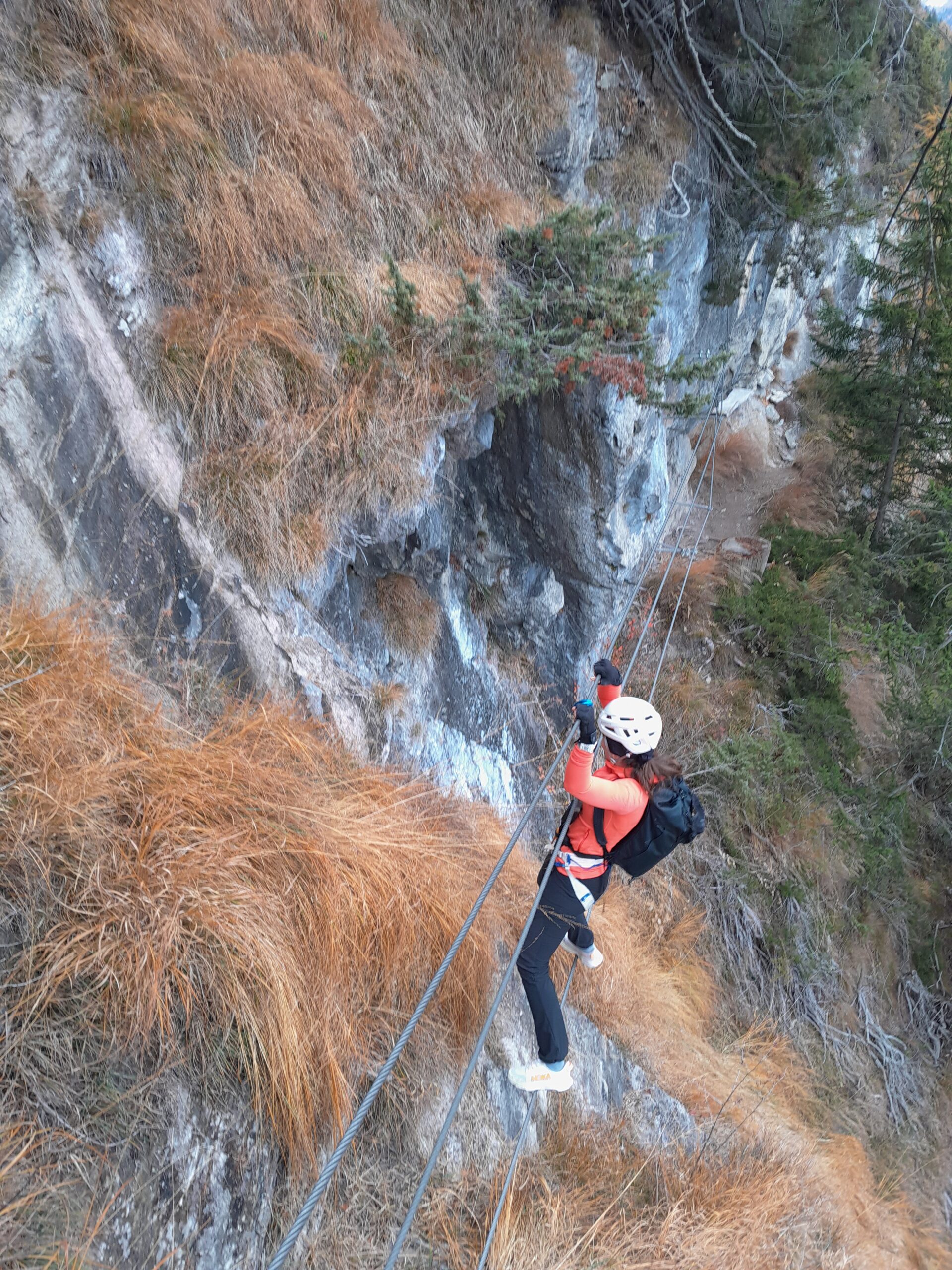 Schon morgens an einem Sonntag im November ist Innsbrucks Stadtbild in Hauptbahnhofnähe geprägt von jungen Menschen, die ausgestattet mit Ski oder Snowboard aufbrechen, um den Bus zum Stubaier-Gletscher zu nehmen. Mein Weg führt mit dem Regionalzug nach St. Jodok am Brenner. Vom dortigen Bahnhof sind es nur wenige Minuten bis zum Einstieg. Zu Beginn fühlen sich die Stahlseile an der Stafflachwand eiskalt an. Je höher wir klettern, desto wärmer wird der Körper und die Finger freuen sich über die Griffe am Felsen und am stählernen Seil. Der Klettersteig ist mir vertraut: Die beiden Seilbrücken und viele Querungen, der feste kristalline Fels, die kurzen überhängenden Stellen mit immer mehr Luft unter mir. Es ist ein körperliches Spiel mit der Schwerkraft. Meine Begleiterin klettert wie ein Eichkätzchen. Unten im Dorf spielt die Musikkapelle und die Schützen schießen eine Salve und die Kirchenglocken läuten. In regelmäßigen Abständen donnert ein Zug an der Brennerstrecke am Fuß der Wand vorbei. Von der gegenüberliegenden Talseite hört man das konstante Dröhnen der Autobahn. Sattgrün sind die Wiesen im Valsertal; golden strahlen die Lärchenhaine; mit Neuschnee angezuckert sind die Berge oberhalb der Waldgrenze; manchmal schaut am Himmel ein Blau zwischen den Wolken hervor. Nur zwei andere Kletterinnen sind an diesem frühen Vormittag unterwegs. Die dunkelvioletten Wacholderbeeren lösen sich von den Stauden, die an manchen Stellen in Wandritzen und auf den felsigen Bändern wachsen. Die Aufmerksamkeit gilt dem je nächsten Griff und Tritt. Ich bin angekommen im Augenblick des Seins. Ich werde mir wieder der eigenen Stärke bewusst, um stark zu bleiben in einer dystopischen Welt, um nicht zu verzweifeln angesichts der Aufrüstung und Kriegssituationen, der dummdreisten Zerstörung der Lebensgrundlagen oder der himmelschreienden Ungerechtigkeiten. Am Bahnhof in Innsbruck sind Horden besoffener Fußballfans und die Luft in den Straßen riecht nach den Abgasen der Autos. Ich träume mich zurück auf die Berge und ihre Stille und will selbst nicht Teil einer Zerstörungskultur sein.