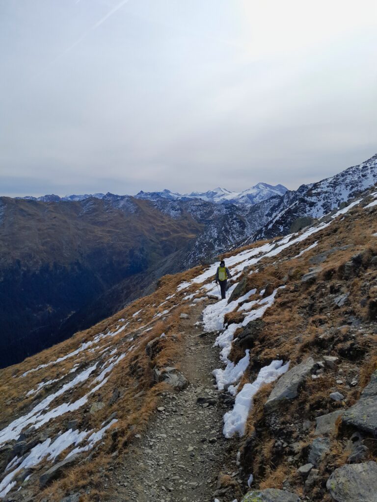 Gestern noch gegenüberliegend am Goetheweg im Karwendel, heute in den Tuxer Alpen, zwei so unterschiedliche Gebirge, die vom Inntal nur getrennt sind. Ein Sonntag ist es, ein Sonntag im Herbst, an dem die Luft schon kühl ist, wenngleich unten im Tal sie noch kühler ist, wo die Reste vom letzten Schneefall nicht mehr weggehen werden,…