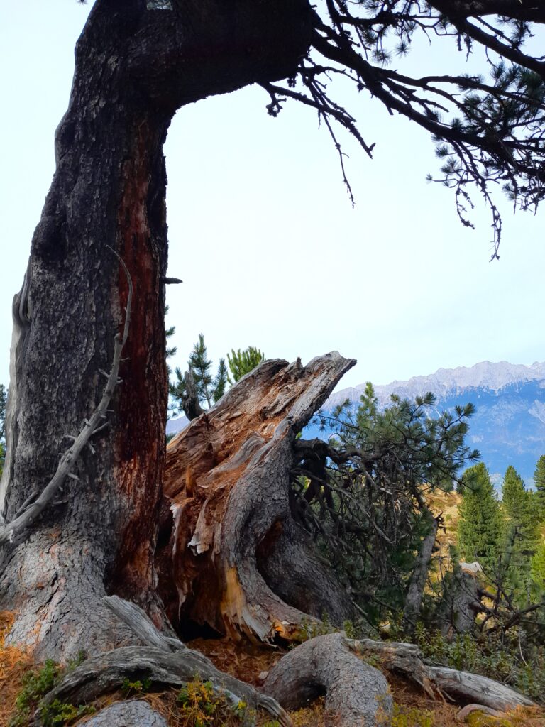 Gestern noch gegenüberliegend am Goetheweg im Karwendel, heute in den Tuxer Alpen, zwei so unterschiedliche Gebirge, die vom Inntal nur getrennt sind. Ein Sonntag ist es, ein Sonntag im Herbst, an dem die Luft schon kühl ist, wenngleich unten im Tal sie noch kühler ist, wo die Reste vom letzten Schneefall nicht mehr weggehen werden, wobei unsere Pfade fast ganz schneefrei sind. Die Berggräser sind braun und in den Murmeltierlöchern wird wohl schon geschlafen. Von Boscheben wählen wir den direkten Weg entlang der Südflanke von Sonnenspitze und Glungezer. Längst schon gleicht mein Gehen einem meditativen Flow, bei dem jeder Schritt wie ein Loslassen von dem ist, was in dieser Welt so schwer ist. Die Viggarspitze lassen wir aus; die Glungezer-Hütte hat längst schon geschlossen; allein sind wir dann am Gipfel des Glungezer, ein Berg, der mir so ganz vertraut ist von vielen Begehungen im Winter. Von der Tulfein weg gehen wir den Zirbenweg zurück zur Bergstation der Patscherkofelbahn. Da sind wir nun nicht mehr allein unterwegs. Ein schnelles Bergwandern ist es geworden: 5 Stunden verteilt auf 18 Kilometer und 1115 Höhenmeter, mit einem Verweilen auf der Spitze des Glungezer und dann inmitten kräftiger Zirben am Beginn des Zirbenwegs.
