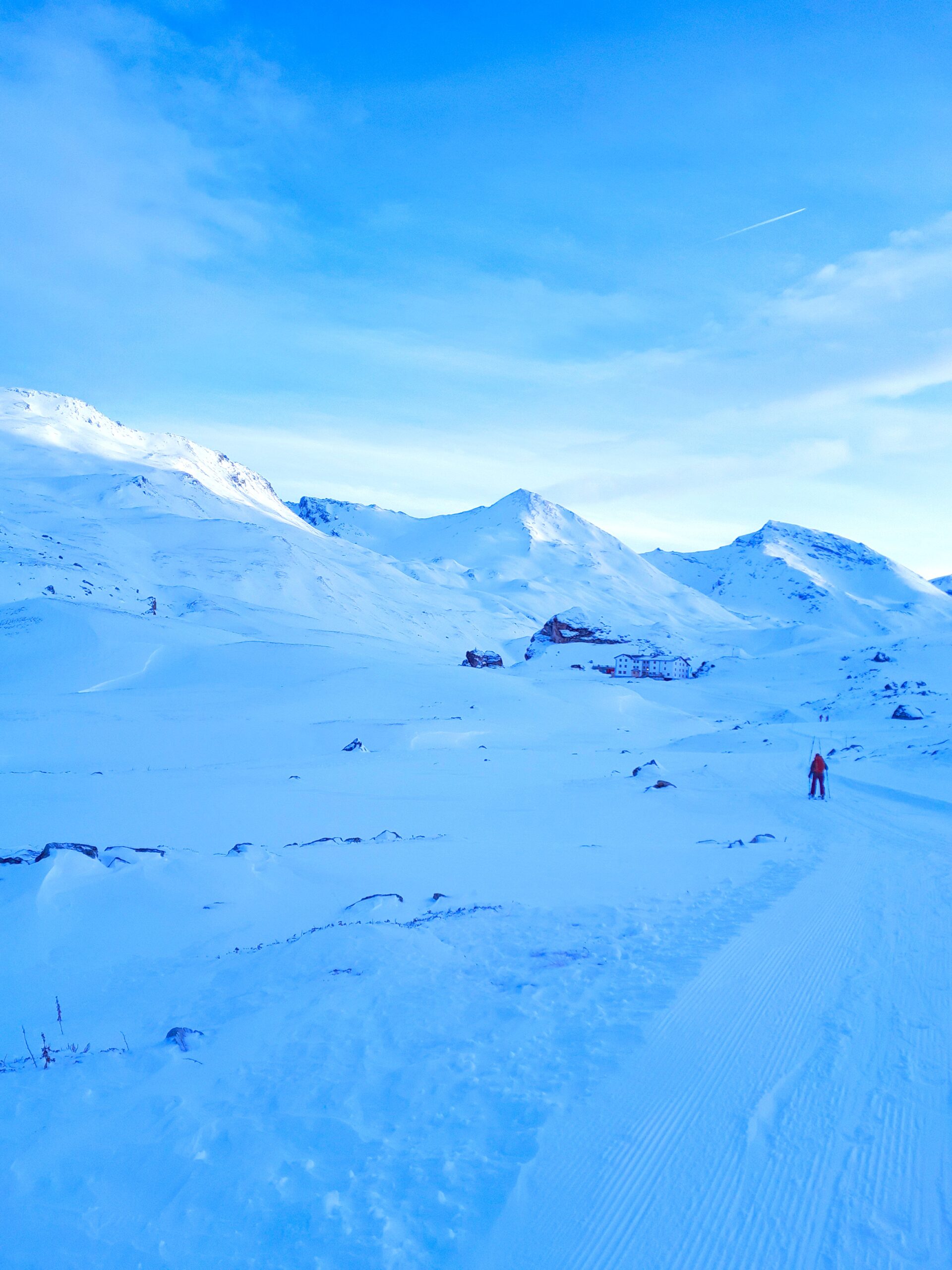 Ich denke an ein Gedicht von Bertold Brecht und höre meine Skifelle auf der Spur kratzen. Tiefblauer Himmel und darin Wolken so schneeweiß wie die Schneelandschaft ringsherum. Nur kärglich bedeckt der Schnee in diesem Winter das Fimbatal mit seinen Gipfelhängen. An manchen Stellen schaut die sanft plätschernde Fimba zwischen windgepressten Schnee-Eisgebilden heraus. Der Fichtenwald auf den steilen Abhängen hinunter ins Paznaun ist längst hinter uns. Auch die Lärchen und selbst die Zirben wachsen dort, wo die Felle der Ski auf der Spur nun achtsam gleiten, nicht mehr. Mein stilles Bergglück vermischt sich mit Versen von Brecht: